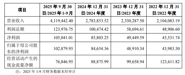 湖南黄金2022年度、2023年度、2024年度与2025年1-9月营收分别为210.41亿元、233.03亿元、278.39亿元、411.94亿元;归母净利润分别为4.40亿元、4.89亿元、8.47亿元、10.29亿元。上市公司主要财务数据和财务指标如下: