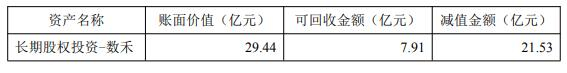 2026年1月,中联资产评估咨询(上海)有限公司接受公司委托对公司所持数禾全部股权涉及的该公司股东部分权益价值进行了评估并出具《资产评估报告》(中联沪评字【2026】第007号),此次评估采用市场法,得出被评估单位在评估基准日2025年12月31日的评估结论如下:公司持有的54.97%数禾股权的账面值为294,383.96万元(未经审计),评估值78,162.84万元,评估减值216,221.12万元,减值率73.45%。