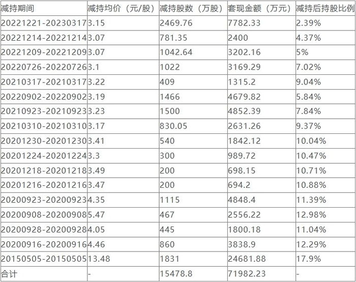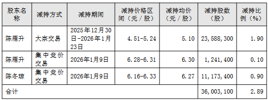 陈雁升于2025年12月30日至2026年1月23日以大宗交易方式减持公司股份23,588,300股,减持价格区间为4.51元/股-5.24元/股,减持均价为5.10元/股;于2026年1月9日以集中竞价交易方式减持公司股份1,241,400股,减持价格区间为6.28元/股-6.31元/股,减持均价为6.30元/股。陈冬琼于2026年1月9日以集中竞价交易方式减持公司股份11,173,400股,减持价格区间为6.16元/股-6.33元/股,减持均价为6.27元/股。合计减持公司股份36,003,100股,根据减持均价计算,套现总金额约198,178,368元。
