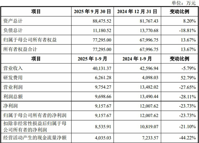 2025年1-9月,恒运昌实现营业收入40,131.37万元,同比下降5.79%;实现净利润/归属于母公司所有者的净利润9,157.67万元,同比下降23.73%;实现扣除非经常性损益后归属于母公司所有者的净利润8,535.91万元,同比下降21.10%;经营活动产生的现金流量净额4,035.03万元,同比下降44.22%。