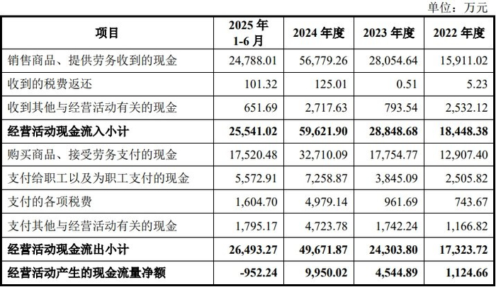 2022年、2023年、2024年和2025年1-6月,恒运昌经营活动产生的现金流量净额分别为1,124.66万元、4,544.89万元、9,950.02万元和-952.24万元,销售商品、提供劳务收到的现金分别为15,911.02万元、28,054.64万元、56,779.26万元和24,788.01万元。