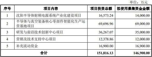 恒运昌本次发行募集资金总额156,065.89万元;扣除发行费用(不含增值税)后,募集资金净额为141,375.76万元。该公司本次发行募集资金净额较原计划少5,524.24万元。根据恒运昌于2026年1月22日披露的招股说明书,该公司拟募集资金146,900.00万元,分别用于沈阳半导体射频电源系统产业化建设项目、半导体与真空装备核心零部件智能化生产运营基地项目、研发与前沿技术创新中心项目、营销及技术支持中心项目、补充流动资金。