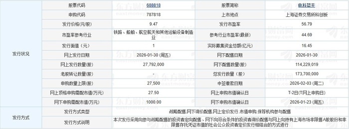 电科蓝天于2026年1月29日发布的首次公开发行股票并在科创板上市发行公告显示,按本次发行价格9.47元/股和17,370.00万股的新股发行数量计算,若本次发行成功,预计电科蓝天募集资金总额164,493.90万元,扣除约6,577.76万元(不含增值税)的发行费用后,预计募集资金净额157,916.14万元(如有尾数差异,为四舍五入所致)。