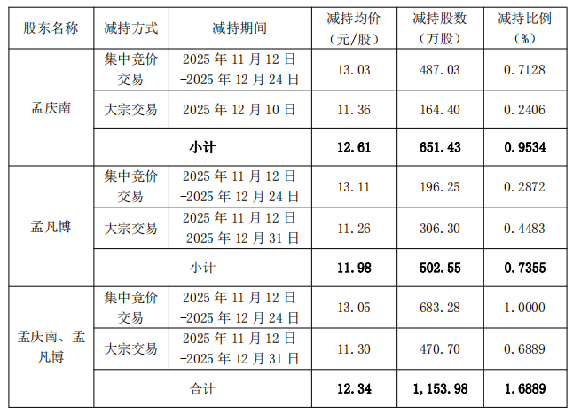 2025年11月12日至2025年12月31日期间,孟庆南合计减持651.43万股,占总股本0.9534%,减持均价12.61元/股;孟凡博合计减持502.55万股,占总股本0.7355%,减持均价11.98元/股。两人合计减持1153.98万股,占总股本1.6889%,减持均价12.34元/股。经计算,两人共套现约1.42亿元。