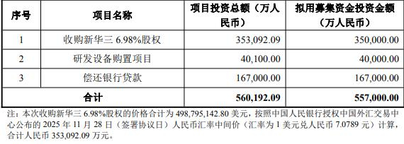 本次向特定对象发行A股股票募集资金总额不超过557,000.00万元(含本数),扣除发行费用后的净额拟投资于收购新华三6.98%股权、研发设备购置项目、偿还银行贷款。其中,收购新华三6.98%股权项目投资总额353,092.09万元。