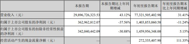 年初至报告期末,公司实现营业收入773.22亿元,同比增长31.41%;归属于上市公司股东的净利润14.04亿元,同比减少11.24%;扣除非经常性损益后的净利润14.60亿元,同比增长5.15%,经营活动产生的现金流量净额2.72亿元。