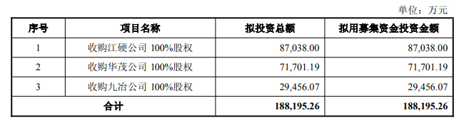 江钨装备昨晚发布2026年度向特定对象发行A股股票预案。本次发行募集资金总额(含发行费用)不超过188,195.26万元,扣除发行费用后将用于收购江西江钨硬质合金有限公司(以下简称“江硬公司”)100%股权、收购赣州华茂钨材料有限公司(以下简称“华茂公司”)100%股权、收购九江有色金属冶炼有限公司(以下简称“九冶公司”)100%股权。