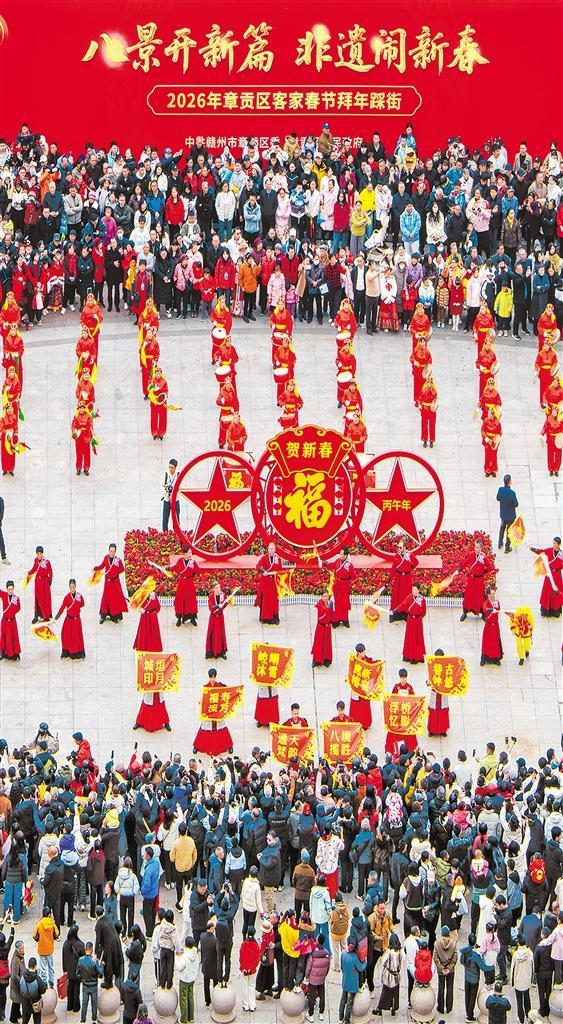 2月17日,江西省赣州市章贡区长征广场的踩街民俗文化活动为春节增添浓浓的年味。