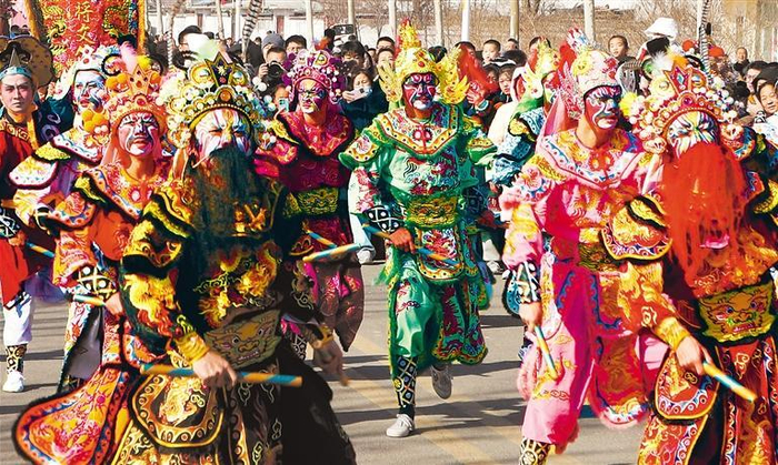2月17日,游客在山东省东营市东营区城南庙会观看国家级非遗潮汕英歌舞表演。