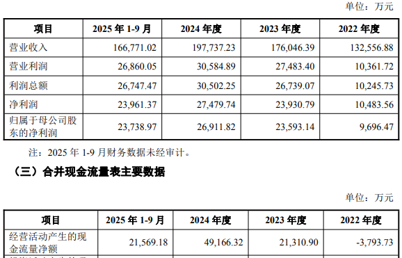 2022年度、2023年度、2024年度、2025年1-9月,瑞立科密营业收入分别为132,556.88万元、176,046.39万元、197,737.23万元、166,771.02万元,归属于母公司股东的净利润分别为9,696.47万元、23,593.14万元、26,911.82万元、23,738.97万元,经营活动产生的现金流量净额分别为-3,793.73万元、21,310.90万元、49,166.32万元、21,569.18万元。