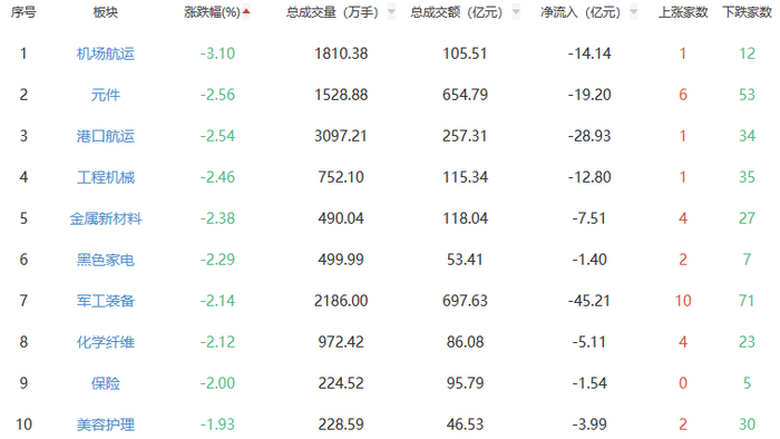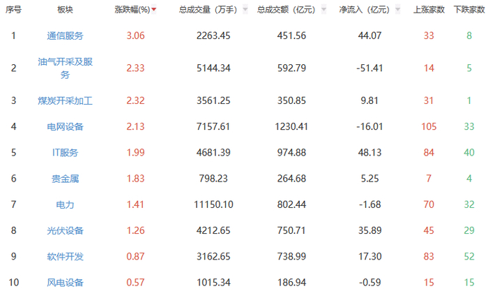 行业板块方面,通信服务、油气开采及服务、煤炭开采加工等板块涨幅居前,机场航运、元件、港口航运等板块跌幅居前。