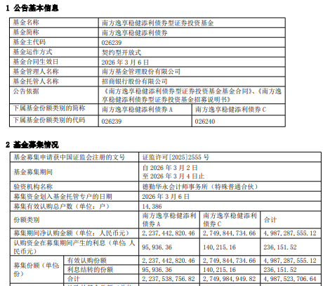 南方逸享稳健添利债券成立 规模49.87亿元