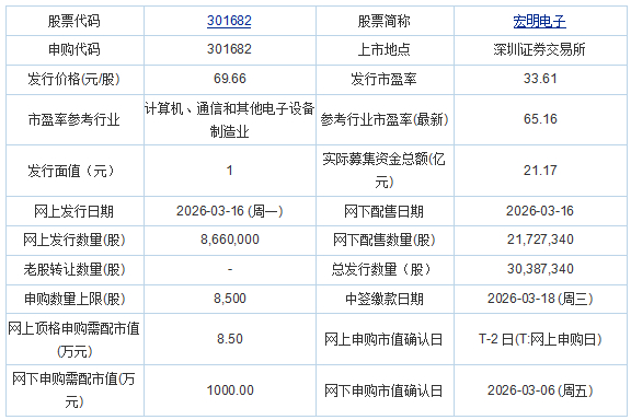 宏明电子2026年3月13日披露的首次公开发行股票并在创业板上市发行公告显示,按本次发行价格69.66元/股计算,公司募集资金总额预计为211,678.21万元,扣除预计发行费用约7,914.74万元(不含增值税)后,预计募集资金净额约为203,763.47万元。