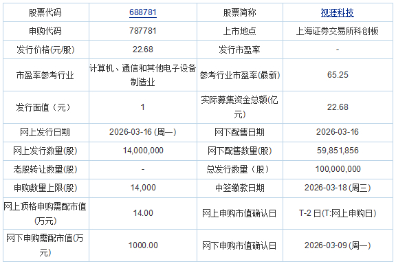 视涯科技2026年3月13日披露的首次公开发行股票并在科创板上市发行公告显示,按本次发行价格22.68元/股和10,000.0000万股的新股发行数量计算,若本次发行成功,预计公司募集资金总额226,800.00万元,扣除约15,326.85万元(不含增值税)的发行费用后,预计募集资金净额211,473.15万元。