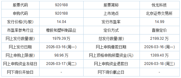 悦龙科技2026年3月12日披露的招股说明书显示,公司拟募资28,900.00万元,用于新建自浮式输油橡胶软管生产项目、橡胶软管生产设施智能化信息化升级改造项目、高端软管研发中心项目和营销服务网络建设项目。