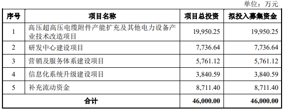 长缆科技2025年5月21日披露的2025年度向特定对象发行股票预案显示,本次发行募集资金总额不超过46,000.00万元(含本数),在扣除相关发行费用后的募集资金净额将全部用于以下项目:高压超高压电缆附件产能扩充及其他电力设备产业技术改造项目、研发中心建设项目、营销及服务体系建设项目、信息化系统升级建设项目和补充流动资金。