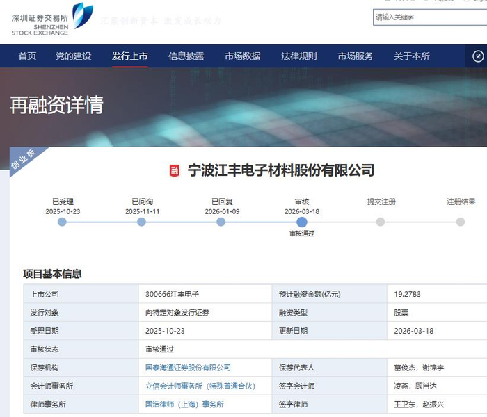 中国经济网北京3月19日讯 江丰电子(300666.SZ)向特定对象发行证券事项昨日获得深交所通过。