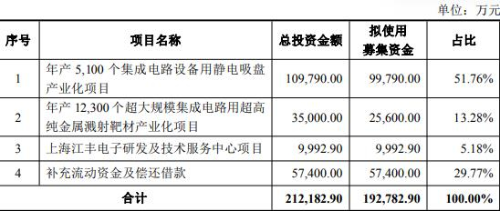 在考虑从募集资金总额中扣除4,000万元的财务性投资后,本次发行的募集资金总额不超过192,782.90万元(含本数),扣除发行费用后拟将全部用于年产5,100个集成电路设备用静电吸盘产业化项目、年产12,300个超大规模集成电路用超高纯金属溅射靶材产业化项目、上海江丰电子研发及技术服务中心项目、补充流动资金及偿还借款。
