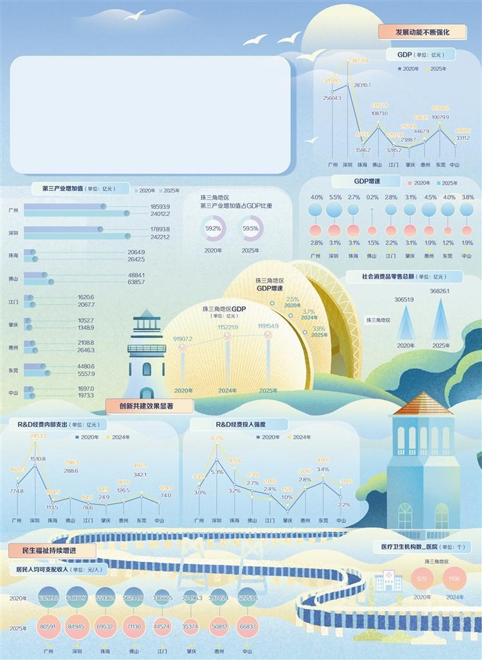 两业双向赋能,畅通了“产业跃升、消费旺盛、民生福祉增进”的经济循环。广东是拥有1.29亿常住人口的大市场,随着两业深度协同,个性化、定制化的产品和服务走进千家万户,多样化的就业岗位增加了居民收入,企业也在多元民生需求中“海阔凭鱼跃”。2020年至2025年,珠三角社会消费品零售总额从3.07万亿元增长至3.68万亿元,居民人均可支配收入持续提升,新制造交织新服务,让高质量发展成果可感可及。