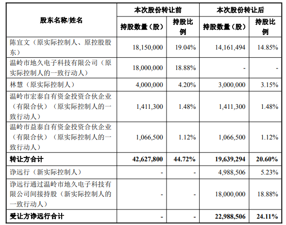 2026年3月30日,陈宜文、林慧及地久电子与诤远行(上海)企业管理合伙企业(有限合伙)(以下简称“诤远行”)共同签署《浙江泰福泵业股份有限公司之控制权收购协议》(以下简称《控制权收购协议》)。上述协议约定,陈宜文、林慧拟以协议转让的方式向诤远行分别转让上市公司3,988,506股股份、1,000,000股股份(分别占上市公司总股本的4.18%、1.05%)。陈宜文、林慧拟以股权转让的方式将地久电子的100%股权向诤远行转让,转让完成后诤远行通过地久电子间接持有上市公司18,000,000股股份(占上市公司总股本的18.88%)。本次转让完成后,诤远行直接和间接合计持有上市公司总股本的24.11%。本次股份转让价格为每股35.67元/股。