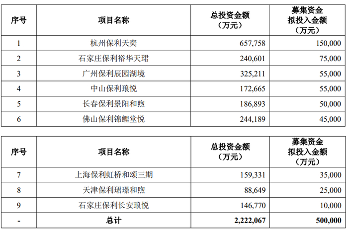 保利发展本次发行募集资金不超过500,000.00万元(含本数)。本次发行的募集资金在扣除发行费用后的净额将用于杭州保利天奕、石家庄保利裕华天珺、广州保利辰园湖境、中山保利琅悦、长春保利景阳和煦、佛山保利锦鲤堂悦、上海保利虹桥和颂三期、天津保利珺璟和煦、石家庄保利长安琅悦。