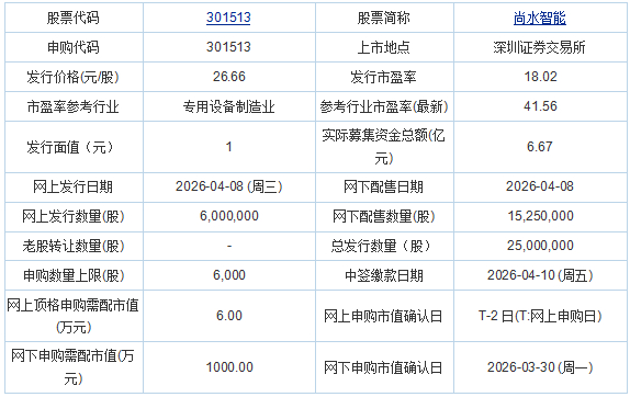 尚水智能2026年4月7日披露的首次公开发行股票并在创业板上市发行公告显示,按本次发行价格26.66元/股,预计公司募集资金总额为66,650.00万元,扣除预计发行费用约7,488.87万元(不含增值税)后,预计募集资金净额约为59,161.13万元。