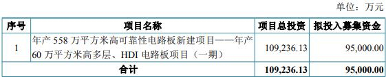 本次向特定对象发行A股股票募集资金总额不超过95,000.00万元(含本数),在扣除发行费用后将用于年产558万平方米高可靠性电路板新建项目——年产60万平方米高多层、HDI电路板项目(一期)。