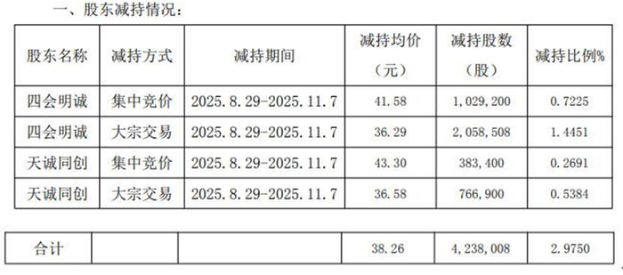 公告显示,2025年8月29日至2025年11月7日,四会明诚和天诚同创减持股数4,238,008股,减持均价38.26元。经计算,四会明诚和天诚同创减持金额共计为1.62亿元。截至2025年12月31日,天诚同创为公司第二大股东。