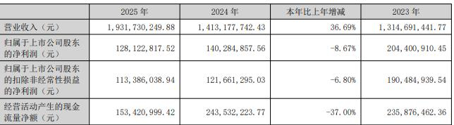 据公司2025年年报,2025年,公司实现营业收入19.32亿元,同比增长36.69%;公司实现归属于母公司所有者的净利润1.28亿元,同比减少8.67%;实现归属于母公司所有者的扣除非经常性损益的净利润1.13亿元,同比减少6.80%;经营活动产生的现金流量净额1.53亿元。
