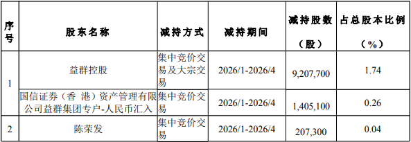 公告显示,2026年1月至2026年4月,益群控股通过集中竞价交易及大宗交易方式,减持9,207,700股;国信证券(香港)资产管理有限公司益群集团专户-人民币汇入通过集中竞价交易方式,减持1,405,100股;陈荣发通过集中竞价交易方式,减持207,300股。上述股东合计减持10,820,100股。