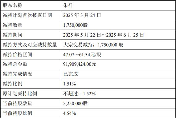 公司2025年6月27日披露股东减持股份结果公告,本次减持计划实施前,公司的股东朱祥持有公司股份7,000,000股,占公司当时总股本的6.10%,近日,公司收到股东朱祥发来的书面告知函,截至2025年6月25日,朱祥通过大宗交易方式累计减持公司股份1,750,000股,占公司目前总股本的1.51%。本次减持总金额91,909,424.00元。经计算,上述2次减持共计330230345.75元。