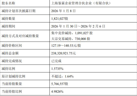 2月7日,公司披露股东减持股份结果暨持股5%以上股东持有权益比例降至5%以下的权益变动提示性公告,本次减持计划实施前,公司股东上海鉴霖企业管理合伙企业(有限合伙)(简称“鉴霖企管”)持有公司股份7,587,584股,占公司总股本的6.56%。近日,公司收到股东鉴霖企管及其一致行动人的书面告知函,鉴霖企管于2026年1月30日至2月6日通过集中竞价和大宗交易方式累计减持公司股份1,821,027股,占公司总股本的1.5735%。本次减持总金额238,320,921.75元。