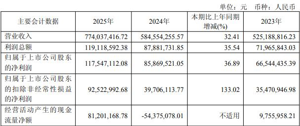 据公司2025年年报,2025年,公司实现营业收入7.74亿元,同比增长32.41%;公司实现归属于母公司所有者的净利润1.18亿元,同比增长36.89%;实现归属于母公司所有者的扣除非经常性损益的净利润9252.30万元,同比增长133.02%;经营活动产生的现金流量净额8120.12万元。