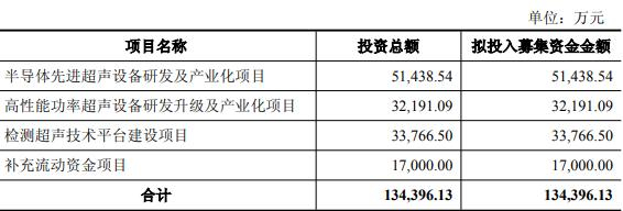 本次向特定对象发行股票募集资金总额不超过人民币134,396.13万元(含本数),扣除发行费用后的净额拟投资于半导体先进超声设备研发及产业化项目、高性能功率超声设备研发升级及产业化项目、检测超声技术平台建设项目、补充流动资金项目。
