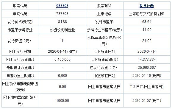 联讯仪器2026年4月13日披露的首次公开发行股票并在科创板上市发行公告显示,按本次发行价格81.88元/股和2,566.6667万股的新股发行数量计算,若本次发行成功,预计公司募集资金总额210,158.67万元,扣除发行费用(不含增值税)19,450.64万元,预计募集资金净额为190,708.02万元。