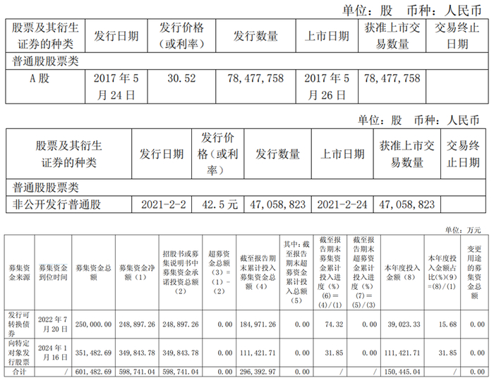 2022年7月20日公司发行可转换债券,募集资金总额250,000.00万元,募集资金净额248,897.26万元。