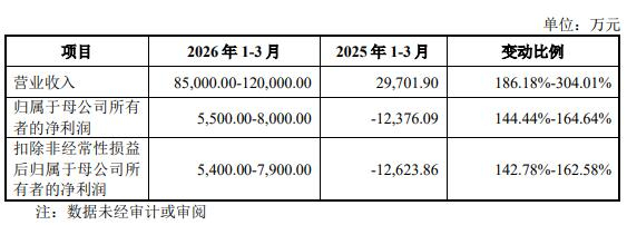 公司结合经营情况及发展趋势,对2026年1-3月业绩进行了初步测算。2026年1-3月,公司预计可实现营业收入约85,000.00万元至120,000.00万元,同比增幅约为186.18%至304.01%;公司预计归属于母公司所有者的净利润5,500.00万元至8,000.00万元;公司预计扣除非经常性损益后归属于母公司所有者的净利润5,400.00万元至7,900.00万元。