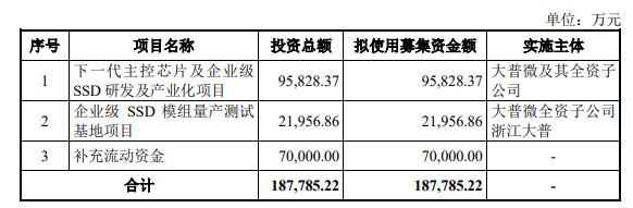 公司最终募集资金净额比原计划多93.77万元。大普微2026年4月10日发布的首次公开发行股票并在创业板上市招股说明书显示,公司拟募集资金187,785.22万元,分别用于下一代主控芯片及企业级SSD研发及产业化项目、企业级SSD模组量产测试基地项目、补充流动资金。