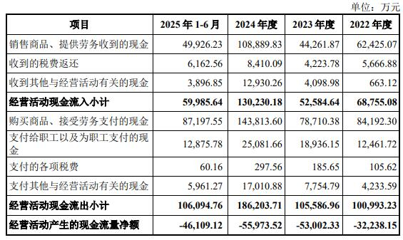2022年、2023年、2024年、2025年1-6月,大普微销售商品、提供劳务收到的现金分别为62,425.07万元、44,261.87万元、108,889.83万元、49,926.23万元;经营活动产生的现金流量净额分别为-32,238.15万元、-53,002.33万元、-55,973.52万元、-46,109.12万元。