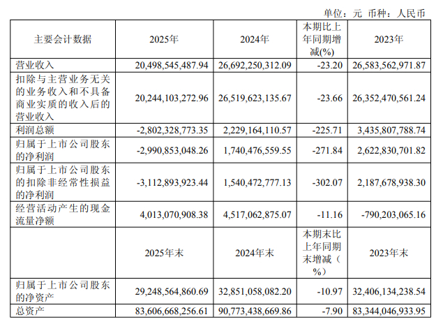中国经济网北京4月17日讯 合盛硅业(603260.SH)昨晚发布2025年年度报告。公司报告期内营业总收入为204.99亿元,同比下滑23.20%;归属于上市公司股东的净利润为-29.91亿元,去年同期为17.40亿元;归属于上市公司股东的扣除非经常性损益的净利润为-31.13亿元,去年同期为15.40亿元;经营活动产生的现金流量净额为40.13亿元。