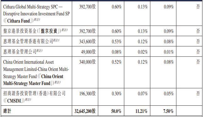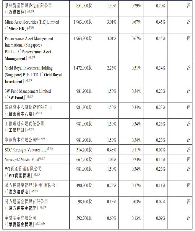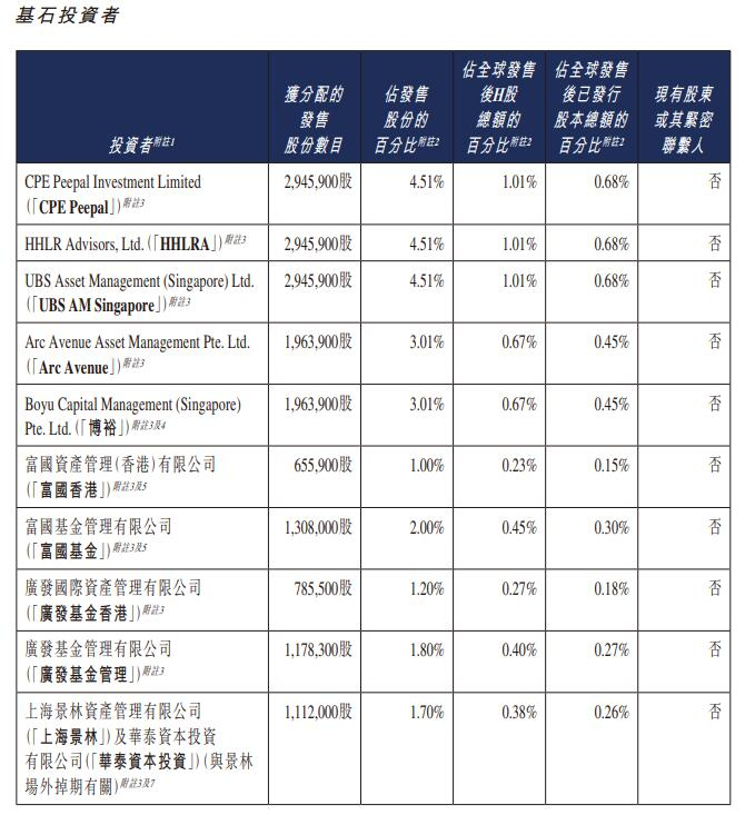 长光辰芯的基石投资者是CPE Peepal Investment Limited、HHLR Advisors, Ltd.、UBS Asset Management (Singapore) Ltd.、Arc Avenue Asset Management Pte. Ltd.、Boyu Capital Management (Singapore) Pte. Ltd.(“博裕”)、富国资产管理(香港)有限公司(“富国香港”)、富国基金管理有限公司(“富国基金”)、广发国际资产管理有限公司(“广发基金香港”)、广发基金管理有限公司(“广发基金管理”)、上海景林资产管理有限公司(“上海景林”)及华泰资本投资有限公司(”华泰资本投资”)、景林资产管理香港有限公司(“香港景林”)、Mirae Asset Securities (HK) Limited、Perseverance Asset Management International (Singapore) Pte. Ltd.、Yield Royal Investment Holding (Singapore) PTE. LTD.、3W Fund Management Limited、钟鼎资本八期投资有限公司(“钟鼎资本八期”)、工银理财有限责任公司(“工银理财”)、宁远资本有限公司、SCC Foresight Ventures Ltd.、Voyage42 Master Fund、WT资产管理有限公司(“WT资产管理”)、易方达资产管理(香港)有限公司(“易方达香港”)、易方达基金管理有限公司(“易方达基金管理”)、华夏基金有限公司(“华夏基金管理”)、Cithara Global Multi-Strategy SPC—Disruptive Innovation Investment Fund SP、盘京港景投资基金(“盘京投资”)、惠理基金管理香港有限公司、惠理基金管理公司、China Orient International Asset Management Limited-China Orient MultiStrategy Master Fund、招商证券投资管理(香港)有限公司。