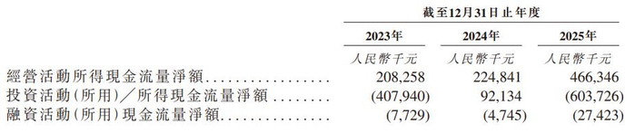 2023年、2024年、2025年,长光辰芯的经营活动所得现金流量净额分别为2.08亿元、2.25亿元、4.66亿元。