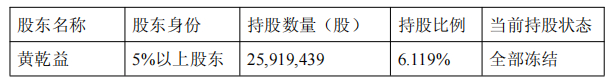 截至公告披露之日,公司股东黄乾益持有公司股份数量为25,919,439股,占公司总股本的6.119%,为公司5%以上股东。