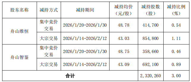 其中,舟山维恒、舟山智鉴计划合计减持不超过2,320,500股公司股份,拟减持比例不超过公司总股本的3.00%。王兆君计划减持不超过112,800股公司股份,拟减持比例不超过公司总股本的0.15%。通过集中竞价交易方式减持的,在任意连续90日内,减持股份的总数不超过公司股份总数的1%;以大宗交易方式减持的,在任意连续90日内,减持股份的总数不得超过公司股份总数的2%。