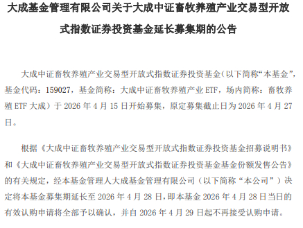 公告称,大成中证畜牧养殖产业交易型开放式指数证券投资基金(基金代码:159027,基金简称:大成中证畜牧养殖产业ETF,场内简称:畜牧养殖ETF大成)于2026年4月15日开始募集,原定募集截止日为2026年4月27日。现决定将该基金募集期延长至2026年4月28日,即该基金2026年4月28日当日的有效认购申请将全部予以确认,并自2026年4月29日起不再接受认购申请。
