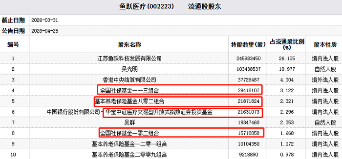 2026年一季报显示,华宝中证医疗交易型开放式指数证券投资基金持有该公司2163.11万股,占其流通股比例的2.30%,为第6大流通股东。此外,大成基金管理的全国社保基金一一三组合、基本养老保险基金八零二组合与博时基金管理的全国社保基金一零二组合,分别持有2941.81万股、2187.18万股、1571.89万股,位居鱼跃医疗第4、第5、第8大流通股股东。