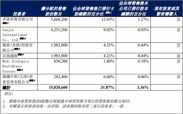 迈威生物本次发行的基石投资者分别为香港君实有限公司、Sanjin International Co., Ltd.、国惠(香港)控股有限公司、昌荣国际、WuXi Biologics HealthCare Venture、锦绣中和(天津)投资管理有限公司。