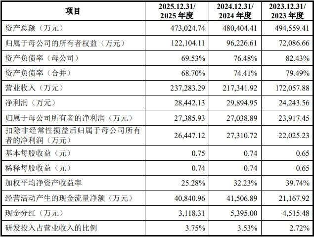 2023年至2025年,理奇智能实现营业收入分别为172,057.88万元、217,341.92万元和237,283.29万元,归属于母公司所有者的净利润分别为23,917.45万元、27,038.89万元和27,385.93万元,扣除非经常性损益后归属于母公司所有者的净利润分别为22,025.23万元、27,310.72万元和26,447.12万元。