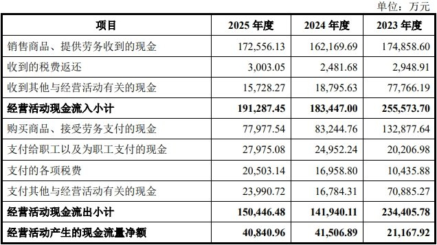 2023年至2025年,理奇智能经营活动产生的现金流量净额分别为21,167.92万元、41,506.89万元和40,840.96万元,销售商品、提供劳务收到的现金分别为174,858.60万元、162,169.69万元和172,556.13万元。