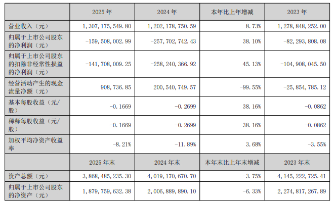 雅本化学2025年度报告显示,公司报告期内营业总收入为13.07亿元,同比增长8.73%;归属于上市公司股东的净利润为-1.60亿元,去年同期为-2.58亿元;归属于上市公司股东的扣除非经常性损益的净利润为-1.42亿元,去年同期为-2.58亿元;经营活动产生的现金流量净额为90.87万元。